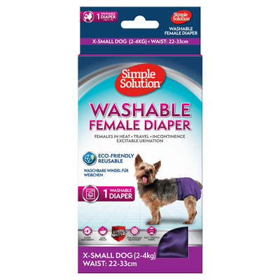 Simple Solution Tvättbart löpskydd är avsedd för tikar som löper eller hundar med inkontinensproblem. Den här återanvändbara blöjan skyddar effektivt golv och möbler från oönskade fläckar. Den är tillverkad av mjukt, stretchigt tyg som ger optimal komfort och rörelsefrihet för din hund. Blöjan har hög absorptionsförmåga och en läckagesäker barriär som håller fukten inne. Den är utrustad med Fur-Friendly Fasteners som håller den på plats utan att klibba fast i pälsen.