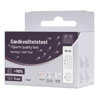 Nordic Tests Spermakvalitetstest Självtest mäter spermiekoncentrationen i ett ejakulatprov och indikerar om koncentrationen ligger inom normalområdet eller lägre. Spermiekoncentrationen är en av de viktigaste parametrarna vid bedömning av manlig fertilitet. Testet är CE-godkänt, levereras med all nödvändig utrustning och steg-för-steg-instruktioner och kräver ingen laboratorieutrustning eller specialkunskaper. Provet bör tas 3-7 dagar efter den senaste utlösningen för att säkerställa ett korrekt resultat.