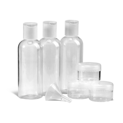 Dessa praktiska reseförpackningar från ValMed uppfyller flygplatsens stränga vätskekrav: Fem behållare med max 100 ml i en transparent och förslutningsbar påse. Med denna uppsättning kan du enkelt ta med dina favoritprodukter. Satsen innehåller också en liten tratt, så att det går lätt att fylla flaskorna.
