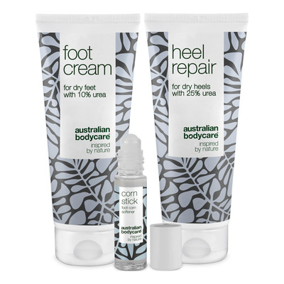 Australian Bodycare Corns & Calluses Kit är den ultimata lösningen för förhårdnader, torra fötter och smärtsamma liktornar. Detta kit består av tre fotvårdsprodukter som är utformade för att lösa upp förhårdnader och återställa mjukhet och smidighet i huden. Setet innehåller en fotkräm med 10% Urea för daglig användning, en intensiv hälkräm med 25% Urea för särskilt torra och hårda områden, och en effektiv liktornolja med salicylsyra för riktad behandling av liktornar. Urea, en viktig ingrediens, binder fukt i huden för att förhindra torrhet och hälsprickor, medan salicylsyra i majsoljan mjukar upp och avlägsnar död hud. Tea Tree Oil i alla produkter säkerställer en hälsosam hudflora. Dermatologiskt testade produkter som är lämpliga för alla hudtyper.