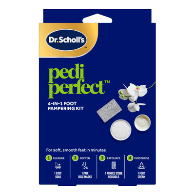 Scholl 4in1 Pampering Foot Treatment är ett allt-i-ett fotvårdskit som effektivt rengör, mjukgör, exfolierar och återfuktar huden. I kitet ingår fotbad, fotmask, pimpsten och fotkräm. Allt du behöver för en komplett hemmabehandling. Produkterna arbetar tillsammans för att ta bort förhårdnader och lämna fötterna mjuka och återfuktade. Lämplig för regelbunden användning för att uppnå och bibehålla mjuka fötter.