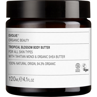 Evolve Tropical Blossom Body Butter är en mjuk kräm som används på kroppen. Body butter innehåller bland annat ekologiskt sheasmör som mjukgör och fuktar huden på djupet. Krämen har en underbar men mild doft av naturlig hibiskus som kan användas av både män och kvinnor.