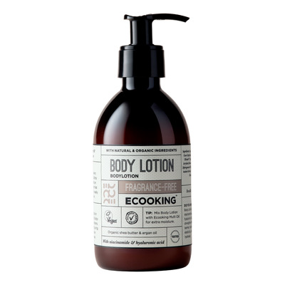 ECOOKING Body Lotion är speciellt utvecklad efter principen om effektiv kroppsvård, vars resultat kan ses. Den innehåller ekologisk argan- och solrosolja, samt naturligt vitamin E, ekologiskt aloe vera-extrakt och vårdande, mjukgörande sheasmör. Andra viktiga ingredienser i Ecooking Body Lotion är hyaluronsyra, som ger fukt på djupet, hjälper till att öka kollagenproduktionen och har en utjämnande effekt, samt niacinamid - bättre känd som vitamin B3 - som hjälper till att reparera hudens struktur. Niacinamid är särskilt lämplig för hud som drabbats av celluliter / apelsinhud och hyperpigmentering.