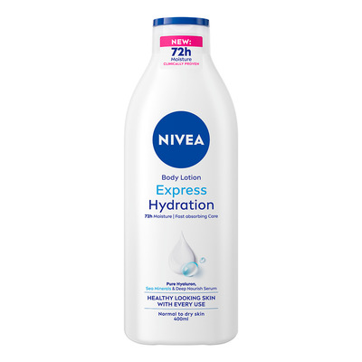 Nivea Express Hydration Body Lotion är en djup återfuktande bodylotion som fuktar huden i upp till 48 timmar. Den är berikad med Niveas Deep Moisture Serum och känns inte kladdig på huden. Hydration Body Lotio absorberas snabbt i huden och lämnar huden återfuktad och välvårdad. Den är lämplig för alla hudtyper, även torr hud. Bodylotionen är dermatologiskt testad.