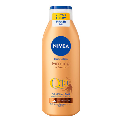 Nivea Q10 Firming + Bronze Body Lotion är en effektiv bodylotion som kombinerar uppstramande egenskaper med en gradvis brun-utan-sol. Den är berikad med Q10, som hjälper till att förbättra hudens elasticitet på bara 10 dagar. Samtidigt ger lotionen en naturligt solbränd look som ger huden en strålande och somrig lyster året runt.