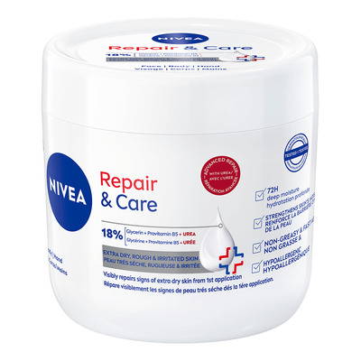 Nivea Repair & Care Body Cream Urea är en effektiv kräm för mycket torr och sträv hud. Den innehåller 15% glycerin och urea som återfuktar huden på djupet och reparerar synliga tecken på torrhet redan efter första appliceringen. Den avancerade formulan skyddar mot fuktförlust och håller huden närd och återfuktad i upp till 72 timmar.