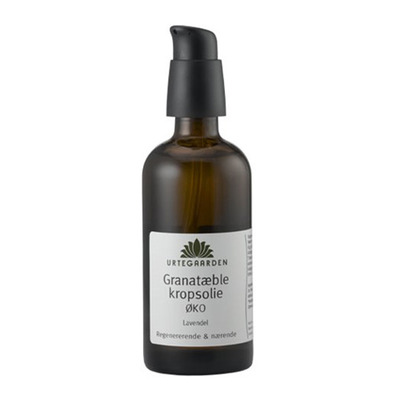 Urtegaarden Kroppsolja Granatäpple Lavendel eko består av 98% ekologiska ingredienser. Den innehåller en hög halt av antioxidanter och essentiella fettsyror som ger näring åt huden utan att kännas fet.