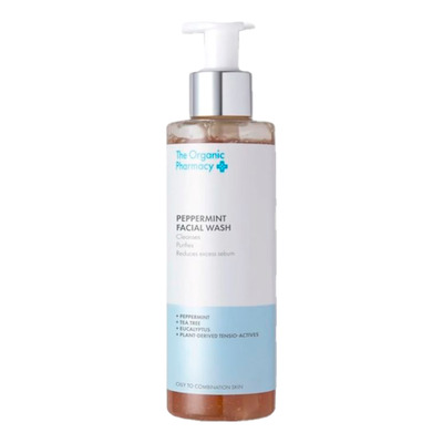 The Organic Pharmacy Peppermint Facial Wash är en effektiv gelrengöring som rengör huden på djupet utan att torka ut. Den är utvecklad för fet, kombinerad och oren hud och innehåller pepparmynta, tea tree och eukalyptus. De aktiva växtingredienserna bidrar till att minska överflödigt sebum och håller huden ren och fräsch. Kliniska tester visar att produkten reducerar bakterier med 65% på bara en minut.