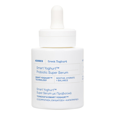 Korres Smart Yoghurt™ Probiotic Super Serum är ett multifunktionellt, doftfritt serum formulerat med Smart Yoghurt™-teknologi. Genom att kombinera äkta grekisk yoghurt med pre- och probiotiska extrakt, havremjölk och näringsämnen från marina alger är tekniken utformad för att återställa balansen i en stressad huds mikrobiom och stärka hudbarriären. Serumet ger en omedelbar fuktboost med en svalkande känsla vid applicering.