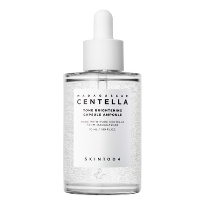 SKIN1004 Madagascar Centella Tone Brightening Capsule Ampoule innehåller inkapslad madekassosid, som stabiliserar ingrediensen och bevarar dess effekt. Askorbinsyra och niacinamid bidrar ytterligare till att förbättra hudens lyster och jämnhet. Den lätta konsistensen absorberas snabbt och lämnar huden återfuktad och lugnad.