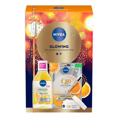 Nivea Glowing Giftpack är en praktisk presentförpackning med tre hudvårdsprodukter. Förpackningen innehåller Nivea Micellar Water Skin Glow, en mild rengöring som avlägsnar smink och orenheter samtidigt som den lämnar huden fräsch. Den innehåller också Nivea Q10 Anti-Wrinkle Energy Sheet Mask, som återfuktar och minskar uppkomsten av fina linjer. Den sista produkten är Nivea Q10 Energy Radiance Boost Day Cream, en dagkräm som återfuktar och ger en fräschare hud.