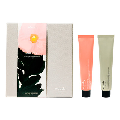 woods_ copenhagen Mask Duo Gift Set är en presentförpackning med två intensiva ansiktsmasker som exfolierar och återfuktar huden