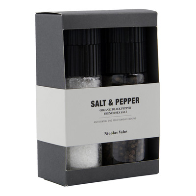 Denna Nicolas Vahé presentförpackning innehåller två klassiska kryddor, salt och peppar. Franskt havssalt utvunnet från Medelhavet är perfekt för att salta alla tänkbara rätter vid alla tillfällen, och när de ekologiska svartpepparkornen mals till en maträtt tillkommer den markanta och fina smaken vi känner från peppar.