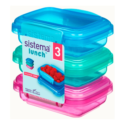 Förvaringslådor 200 ml i fina färger med Sistemas enkla och praktiska Klip It stängningsmekanism. De är perfekta att ta med i väskan, oavsett om det är för barnens fruktpaus eller för små snacks på jobbet.