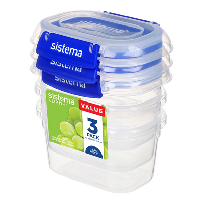 Sistema Klip It Plus Rectangle 3 pack 400 ml är ett paket med tre identiska rektangulära förvaringslådor i transparent plast med blå låsclips. Varje låda rymmer 400 ml och är lämplig för förvaring av matrester, grönsaker, fruktbitar och andra livsmedel i kylen eller frysen. Boxarna är utrustade med Sistemas patenterade låsclips och flexibla försegling för att hålla innehållet fräscht längre.
