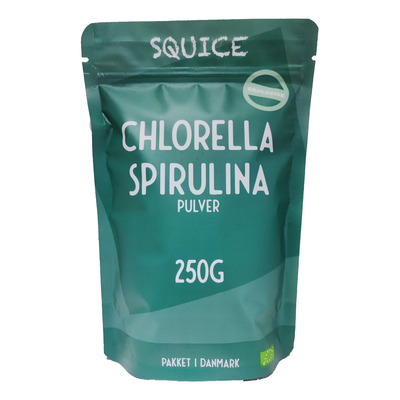 Squice Ekologisk chlorella och spirulina är en kombination av två sötvattensalger som båda är naturligt rika på klorofyll och vegetabiliskt protein. Pulvret är ekologiskt, veganskt och fritt från tillsatser. Chlorella och spirulina används ofta som tillskott i en varierad kost och har en karakteristisk grön färg och smak. Produkten är förpackad i Danmark och är lätt att använda i kalla rätter som smoothies, juicer och yoghurt. Pulvret består helt av torkade och finmalda alger utan andra ingredienser.