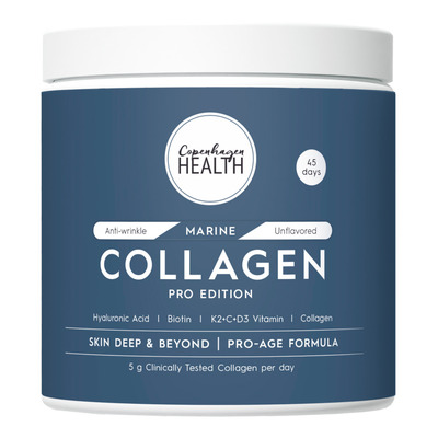Copenhagen Health Marine Collagen Pro Edition innehåller kliniskt och dermatologiskt testat kollagenpulver med en bevisad effekt på att minska rynkor och fina linjer. Det 100% hydrolyserade marina kollagenpulvret innehåller hyaluronsyra, en kombination som hjälper till att bibehålla hudens struktur och fasthet. Kollagenpulvret stöder också benstomme, muskler, hår och immunförsvar med tillsats av vitamin C, D3, K2 och biotin.