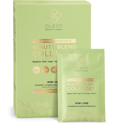 Plent Beauty Blend Collagen Kiwi Lime är ett kosttillskott med hydrolyserade marina kollagenpeptider från hållbart odlad fisk i kombination med 12 aktiva vitaminer och mineraler. Produkten innehåller ett livsmedelsbaserat B-komplex (B1, B2, B3, B5, B6, biotin, folsyra och B12), C-vitamin från acerola, zink, koppar och mangan. Varje dospåse innehåller den rekommenderade dagliga dosen och är naturligt smaksatt med kiwi och lime.