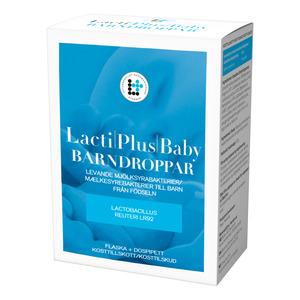 LactiPlus Baby Barndroppar innehåller 100 miljoner levande mjölksyrabakterier (Lactobacillus reuteri LR92) per daglig dos. Detta kosttillskott är speciellt framtaget för spädbarn och kan användas från födseln. Den patenterade behållaren med skruvlock gör det enkelt och hygieniskt att dosera dropparna. LR92-stammen är en av de mest undersökta probiotiska stammarna för spädbarn och har valts ut med fokus på den känsliga tarmfloran hos små barn.