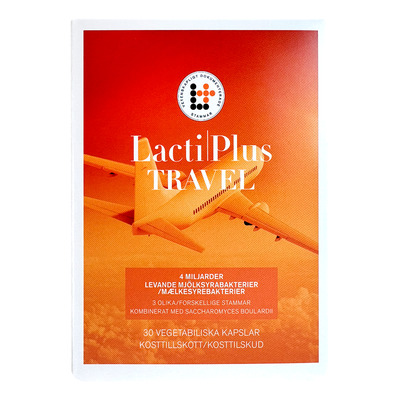 LactiPlus Travel är mjölksyrabakterier som aktiveras först vid kroppstemperatur och därför kan förvaras utanför kylskåpet, vilket gör dem praktiska att ta med i resväskan på semestern. Produkten innehåller den probiotiska jästen Saccharomyces boulardii.