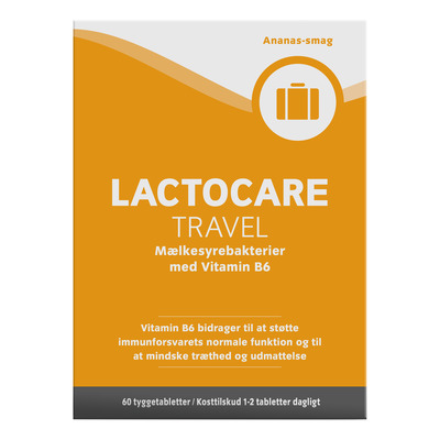 Lactocare Travel innehåller mjölksyrabakterier och vitamin B6 för att stödja tarmfloran på resan