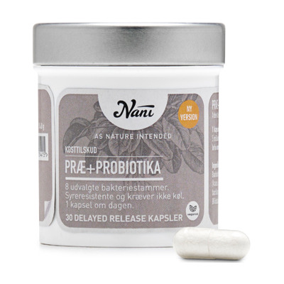 Nani återlanserar nu sin populära Præ+Probiotika i en förbättrad version som bygger på den senaste kunskapen om probiotiska stammar och prebiotiska fibrer. Produkten har vidareutvecklats när det gäller antalet bakteriestammar, mängden bakterier per kapsel, den prebiotiska basen och förpackningen för optimal förvaring av mjölksyrabakterier.