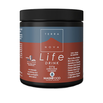 Life Drink fra Terranova är ett kosttillskott med 100% aktiva ingredienser. Den består av en blandning av prebiotika, probiotika, alger, frystorkat grönat och frystorkade bär, omega 3, 6 och 9 fettsyror samt matsmältningsenzymer.