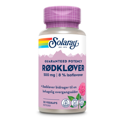 Solaray Rödklöver innehåller 500 mg rödklöverextrakt per kapsel från blomman och de ovanjordiska delarna. Extraktet är standardiserat till ett innehåll av 8% isoflavoner, vilket motsvarar 40 mg per kapsel. Rödklöver är en naturlig källa till fytoöstrogener och används ofta vid klimakteriet. Tillskottet är veganskt och laboratorietestat, och kapslarna är tillverkade i en vegetabilisk kapsel.