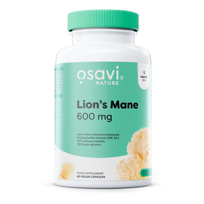 Osavi Lion's Mane 600 mg är ett kosttillskott med 600 mg Hericium erinaceus fruiting bodies extract per kapsel. Extraktet innehåller minst 40% polysackarider, vilket motsvarar 240 mg per daglig dos.