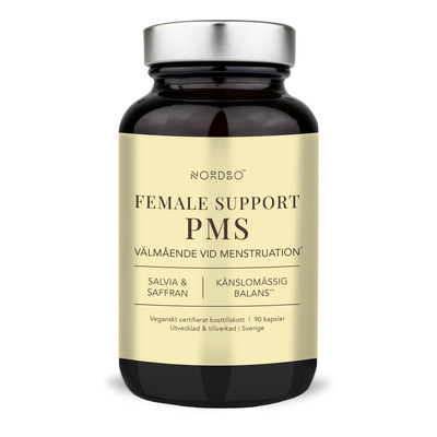 NORDBO Female Support PMS är ett veganskt kosttillskott med 10 aktiva ingredienser, bl.a. magnesium, zink, selen, vitamin B6 och det patenterade enzymkomplexet Digezyme® (amylas, proteas, laktas, lipas och cellulas). Det innehåller också extrakt från saffran, salvia, rödklöver och ingefära. Magnesium och vitamin B6 bidrar till att minska trötthet och utmattning, medan zink bidrar till normal hormonbalans. Selen bidrar till att skydda cellerna från oxidativ stress.