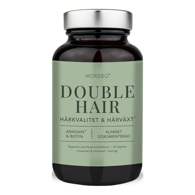 NORDBO Double Hair kombinerar det ekologiska ärtextraktet AnaGain med högdoserad biotin och är framtagen för att stimulera hårsäckarna, minska håravfall och förbättra hårets kvalitet. AnaGain extraheras från ärtskott, som är särskilt rika på bioaktiva ämnen som aktiverar cellerna i hårsäckarna. Biotin bidrar till att bibehålla normalt hår.