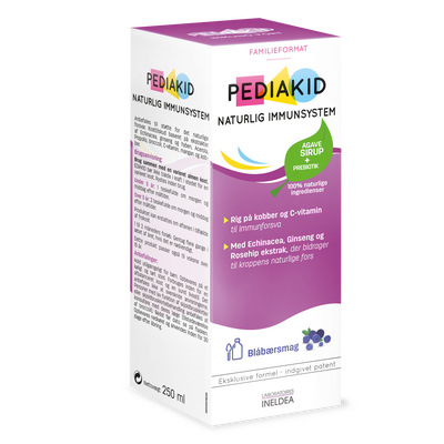 Pediakid Naturlig Immunsystem är ett kosttillskott speciellt utformat för barns immunsystem. Får användas från 15 år. Kosttillskottet är rikt på C-vitamin, koppar och har en underbar smak av blåbär - en smak som ditt barn kommer att älska! Den unika formeln innehåller 100% naturliga ingredienser och innehåller ginseng, nypon och echinacea extrakt som bidrar till kroppens naturliga försvar. Pediakid är utvecklat av Ineldea Laboratories och är bestseller på den franska marknaden. Ineldea Laboratories producerar kosttillskott för barn som både är praktiska, roliga och med en naturlig formel.