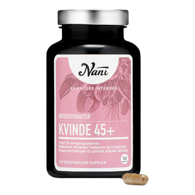 Med detta holistiska tillskott från danska Nani får du ett helt naturligt tillskott som bidrar till att lindra några av de typiska symtomen som är förknippade med kvinnans klimakterie. Tillskottet är noggrant sammansatt av utvalda örtextrakt som arbetar tillsammans för att främja ditt välbefinnande i vardagen. Kvinna 45+ innehåller bl.a. rödklöver som bidrar till att minska svettningar, oro och irritabilitet, samt rosenrot som hjälper kroppen att anpassa sig till känslomässig stress och är gynnsam vid sömnproblem.