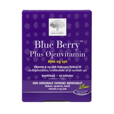 Våra ögon behöver speciella näringsämnen för att fungera optimalt. Speciellt utvalda bioaktiva mikronäringsämnen och örtextrakt i varje tablett av New Nordic Blue Berry Plus ger näring till dina ögon. Tabletten, som produceras i Sverige, innehåller blåbär, ögontröst och tagetesblomextrakt - som produceras genom en speciell process, så att innehållet av lutein är standardiserat. Innehållet av vitamin A och zink bidrar till upprätthållandet av normal syn.