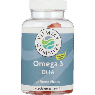 Yummy Gummies från Fitness Pharma Omega 3 DHA innehåller 125 mg DHA (dokosahexaensyra) per dagsdos. DHA är en omega-3-fettsyra som bidrar till att bibehålla normal hjärnfunktion och synförmåga vid ett dagligt intag på 250 mg. Detta är ett kosttillskott som kompletterar en varierad kost.