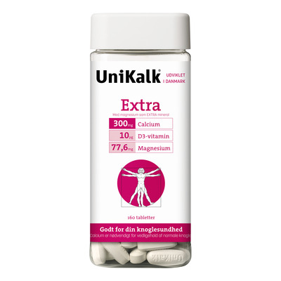 03-02-2010UNIKALK EXTRA M/D-VIT OG MAGNESIUM. Jeg er en kvinde på 51 år, og min læge anbefalede mig at tage ekstra D-vitamin, samtidig anbefalede hun så, at jeg bare kunne tage Unikalk Extra m/D-vitamin. At der så også er magnesium tager jeg blot som et ekstra bonus. Det er let at handle via Med24, og så er det også langt billigere end apotekets. Med venlig hilsen Helle Hansen