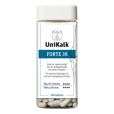 UniKalk Forte 38 innehåller en kombination av kalk som bidrar till normal benstomme och hela 38µg vitamin D per tablett, som täcker 760% av det dagliga referensintaget för vuxna. Tabletterna är särskilt lämpliga för dig som vill komplettera din dagliga kost med kalcium och dessutom behöver ett högt vitamin D-tillskott.