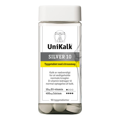 Silver 10 tuggtabletter från Unikalk med citrussmak är för dig som vill komplettera din dagliga kost med både kalk och D-vitamin. Ett innehåll av 10 μg vitamin D per UniKalk Silver hjälper dig att möta ett ökat behov av D-vitamin i samband med kalk. Den tuggbara tabletten har en frisk citrussmak och är lämplig för dem som har svårt att svälja tabletter och som vill ha en tablett som smälter lätt i munnen.