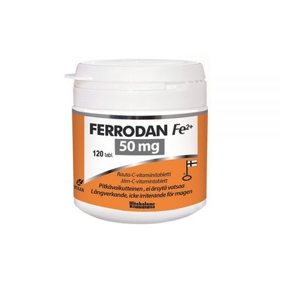 Detta järntillskott är framställt med 50 mg järn och 50 mg C -vitamin och är lämpligt för gravida kvinnor, veganer, vegetarianer, blodgivare och personer som är mycket fysiskt aktiva. Ferrodan Fe2 + 50 mg frigör järn i tarmen under sex timmar, medan C -vitamin ökar upptaget av järn. Järn (II) bisglycinat är ett kelat av järn och glycin aminosyra från vilket järn absorberas i kroppen. Dessutom bidrar järn till att minska trötthet och utmattning.