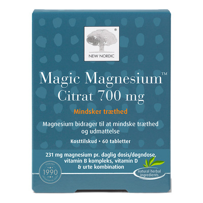 New Nordic Magic Magnesium Citrate är ett kosttillskott med en hög dos magnesium och ett balanserat innehåll av B-vitaminer och D-vitamin. Detta tillskott innehåller även fransk maritim tallbark och långpeppar. Magnesium bidrar tillsammans med folsyra till att minska trötthet.