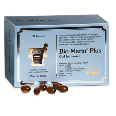 Bio-Marin Plus från Pharma Nord består av mjuka gelatinkapslar med 500 mg koncentrerad fiskolja pr kapsel och en omega-3-halt på 65% (38% EPA, 22% DHA och 5% andra omega-3-fettsyror). Bio-Marin Plus är även tillsatt B-vitaminerna folsyra och vitamin B12, som bidrar till att normalisera nivån av ämnet homocystein i blodet samt normala psykologiska funktioner och ett normalt immunförsvar.