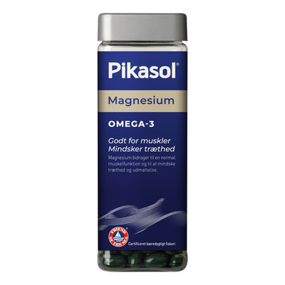 Pikasol Magnesium är ett klassiskt fiskoljetillskott med en twist. Detta tillskott kombinerar omega-3 från fiskolja med magnesium, C-vitamin och D-vitamin. Omega-3 innehåller fettsyrorna EPA och DHA, som bidrar till en normal hjärtfunktion. DHA bidrar också till att bibehålla normal hjärnfunktion och normal syn. Den gynnsamma effekten ses vid ett dagligt intag av 250 mg DHA och EPA. Dessutom bidrar magnesium till normal muskelfunktion och, tillsammans med C-vitamin, till att minska trötthet och utmattning. D-vitamin spelar en roll för att bibehålla normal benstomme och normala tänder.
