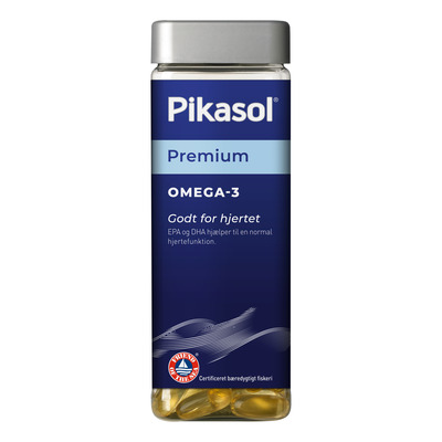 Pikasol Premium Omega-3 är ett kosttillskott med ren, högkoncentrerad fiskolja, som ser till att din kropp får den rekommenderade dagliga tillförseln av omega-3-fettsyror. Fiskolja innehåller omega-3-fettsyrorna EPA och DHA, som bidrar till normal hjärtfunktion. Denna välgörande effekt uppnår du med ett dagligt intag av 250 mg DHA och EPA. Vidare bidrar DHA till upprätthållandet av normal hjärnfunktion samt normal syn med dagligt intag av 250 mg DHA.