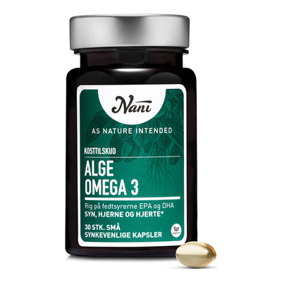 Nani Algae Omega 3 är ett 100 % veganskt kosttillskott som innehåller omega-3-fettsyrorna EPA och DHA. En kapsel Nani Algae Omega 3 innehåller 250 mg DHA och 50 mg EPA.