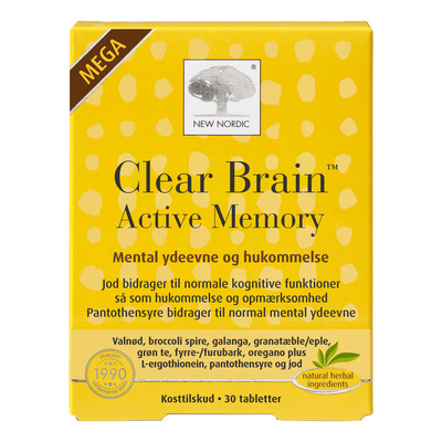 New Nordic Clear Brain Active Memory är ett kosttillskott med jod och utvalda B-vitaminer. Jod bidrar till normala kognitiva funktioner. Pantotensyra bidrar till normal mental prestationsförmåga. Riboflavin, niacin, vitamin B6 och B12 bidrar till att minska trötthet och utmattning. Tiamin, riboflavin, niacin, vitamin B6 och B12 bidrar till nervsystemets normala funktion och normala psykologiska funktioner.