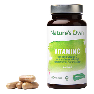 Nature's Own Vitamin C är ett kosttillskott med C-vitamin från Acerola körsbär, som odlas och torkas varsamt. Slutprodukten är i kapslar. På så sätt får du inte bara en kapsel med C-vitamin, utan även de naturligt förekommande bioflavonoiderna. C-vitamin bidrar bl.a till att minska trötthet och utmattning samt för immunsystemets normala funktion. Vidare bidrar C-vitamin till normal bildning av kollagen, vilket är viktigt för normalt fungerande blodkärl, skelett, brosk, hud, tandkött och tänder, samt för en normal energiomsättning.