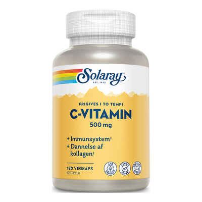 C-vitamin från Solaray är ett kosttillskott i kapselform, som innehåller L-askorbinsyra, nypon och acerola. Vitaminet frigörs i två steg: 50% av vitaminet släpps omedelbart, medan de återstående 50% frigörs i små mängder under 12 timmar. Vitaminet är i vegetabiliska HPMC-kapslar.