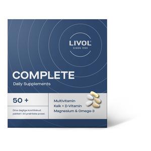 Livol Complete 50+ är ett komplett kosttillskott speciellt framtaget för vuxna över 50 år. Varje ask innehåller 30 dagspåsar, vilket gör det lätt och praktiskt att ta dina kosttillskott. Påsarna innehåller 2 x multivitamintabletter, 2 x kalciumtabletter och 1 x omega-3-kapsel. Kosttillskotten är utvecklade i Danmark och anpassade till kroppens behov med åldern.