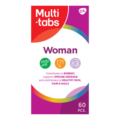 Multi-Tabs Woman innehåller biotin och zink som bidrar till att bibehålla normal hud och hår. Det innehåller också selen och zink som bägge bidrar till att bibehålla normala naglar. Den rekommenderade dagliga dosen är 1 tablett. Produkten är framtagen för kvinnor och unga tjejer från 11 års ålder. Tabletten tas i samband med en måltid.