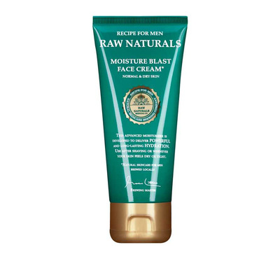 Raw Naturals Moisture Blast Face Cream är en extra återfuktande ansiktskräm för män som har en aktiv livsstil eller naturligt tenderar att ha torr hud. Ansiktskrämen innehåller havre, kokos och olivolja som har en återfuktande, mjukgörande och lugnande effekt på huden. Krämen innehåller även humleextrakt som vårdar huden på djupet.